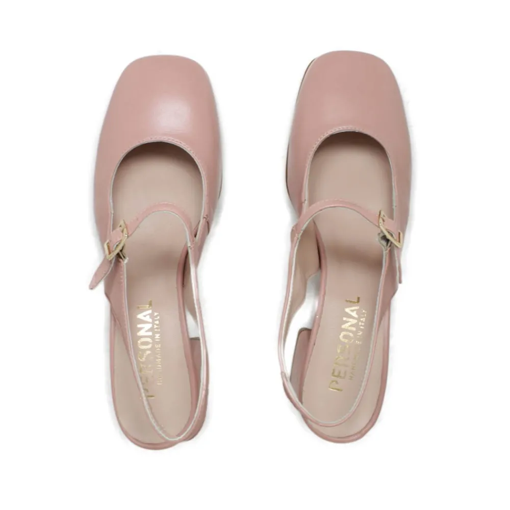 Slingback modello Mary Jane in morbida pelle nappa colore nude, con tacco 5,5 cm. Il modello più di tendenza di questa nuova stagione.