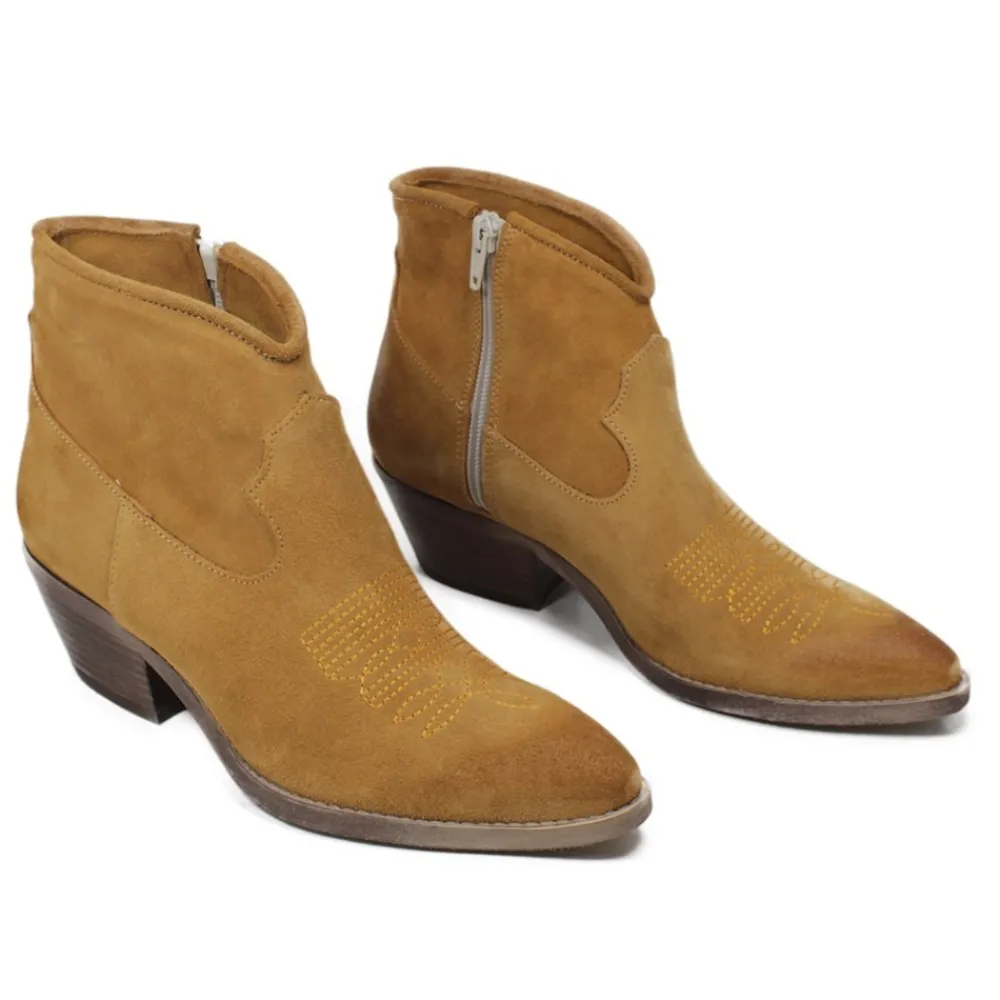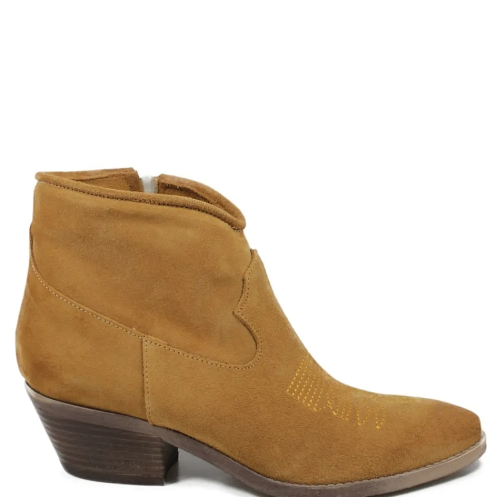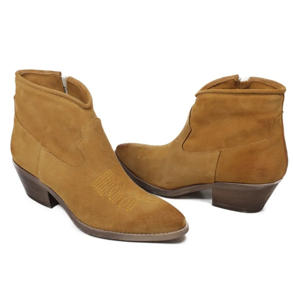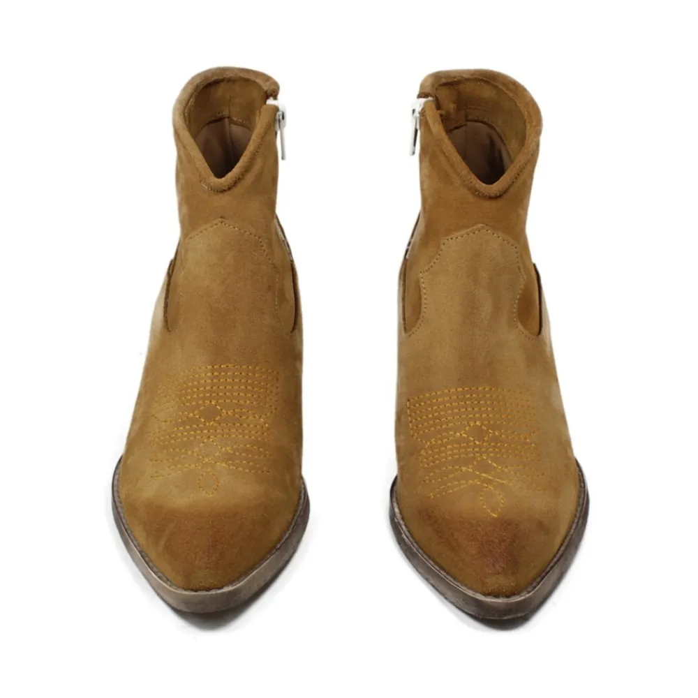 Stivaletti camperos texani alla caviglia con tacco 5 cm, ankle boots con ricamo, in vera pelle scamosciata color cuoio.