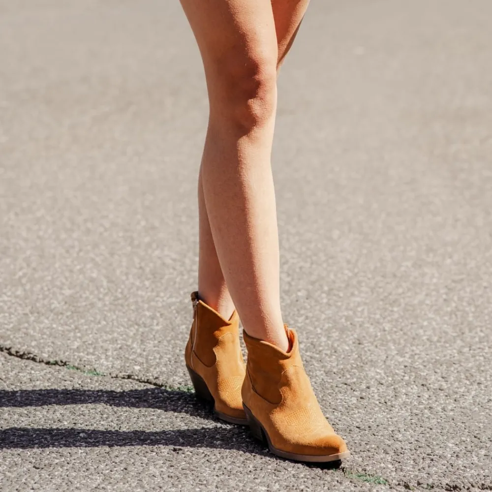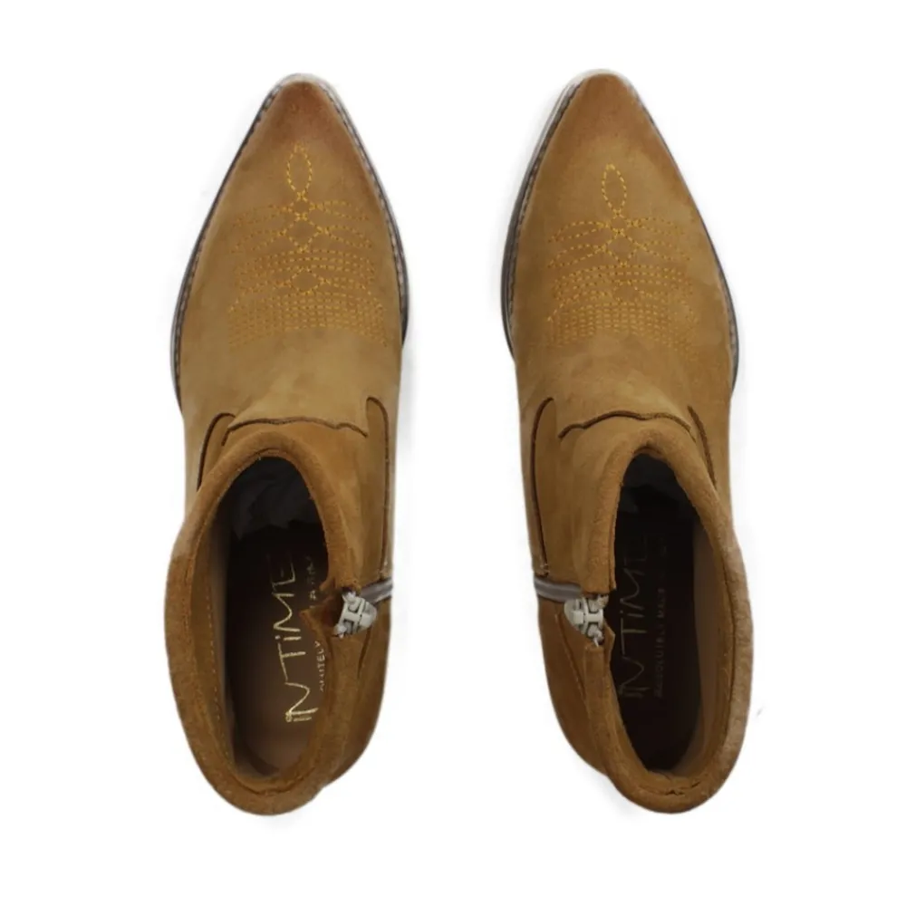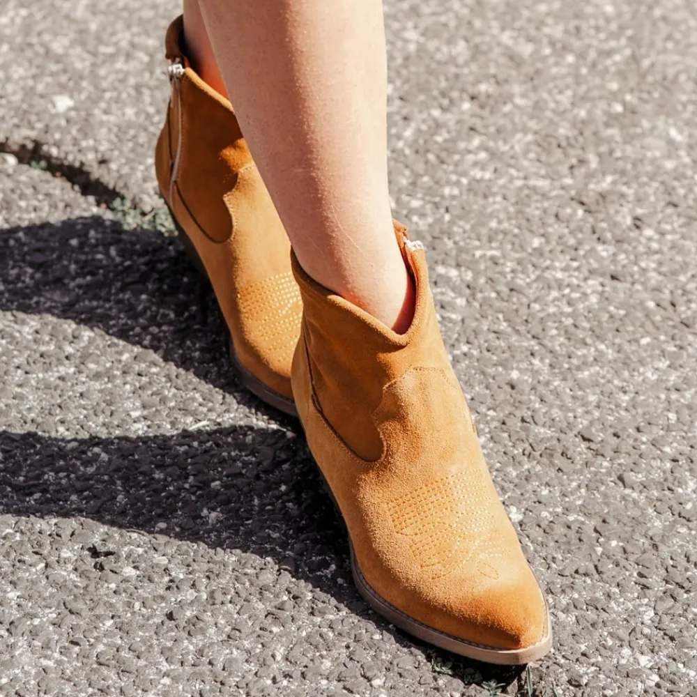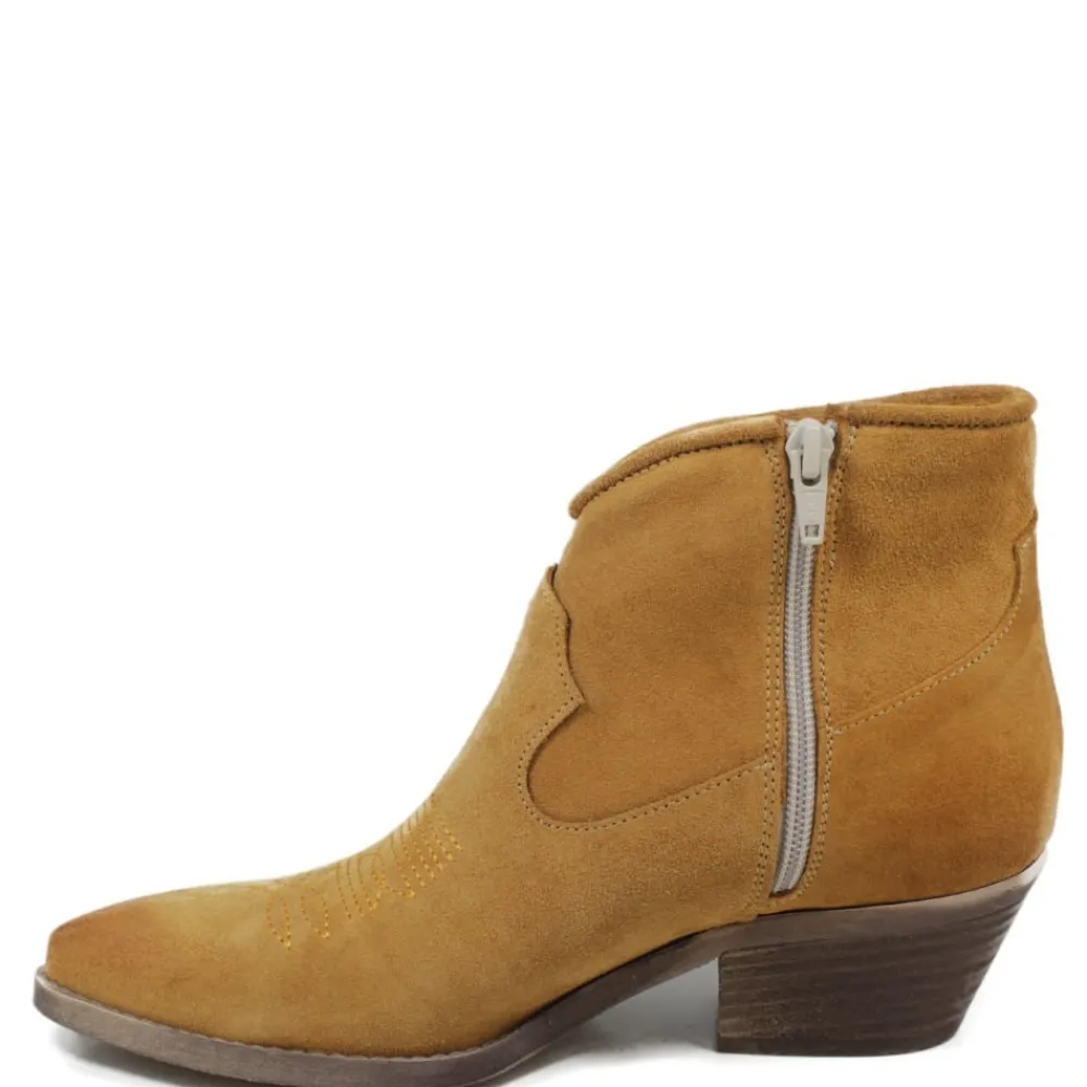 Stivaletti camperos texani alla caviglia con tacco 5 cm, ankle boots con ricamo, in vera pelle scamosciata color cuoio.