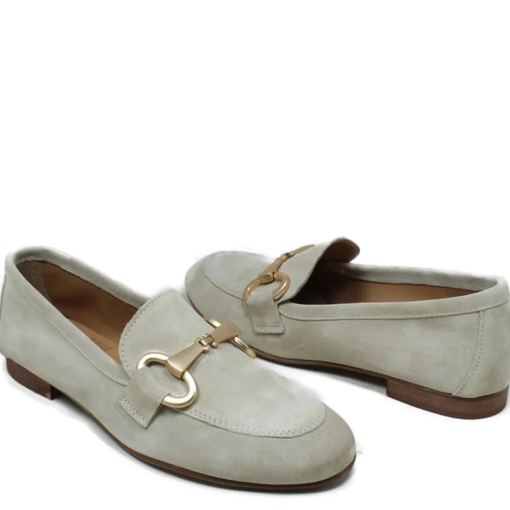 Mocassini flat donna in vera pelle scamosciata beige, con accessorio morsetto metallico. Brand: In Time – Absolutely Made in Italy